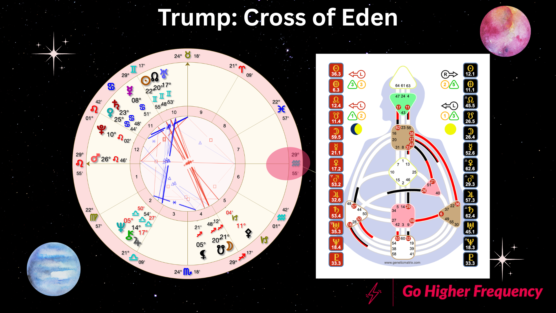 Trump’s a 1/3 Emotional Manifesting Generator, born on the Cross of Eden. Children born as 1/3 profiles on this Cross can learn very early in life about corruption. They have the propensity to accept that this is just the way the world works. 1/3 profiles can typically be more focused on the material, but you can also see his obsession with money in the channel appropriately called the Money Line channel. His Uranus is conjunct the North Node in gate 45, which symbolizes the material direction of the tribe. This connects to his design Mercury in gate 21, the gate symbolizing control of the material direction. This channel is tribal in nature: he's not concerned with maximizing the material direction of anyone outside of his particular group – only those who are loyal to him. He’s here to change our material direction and he wants to control every part of that direction.