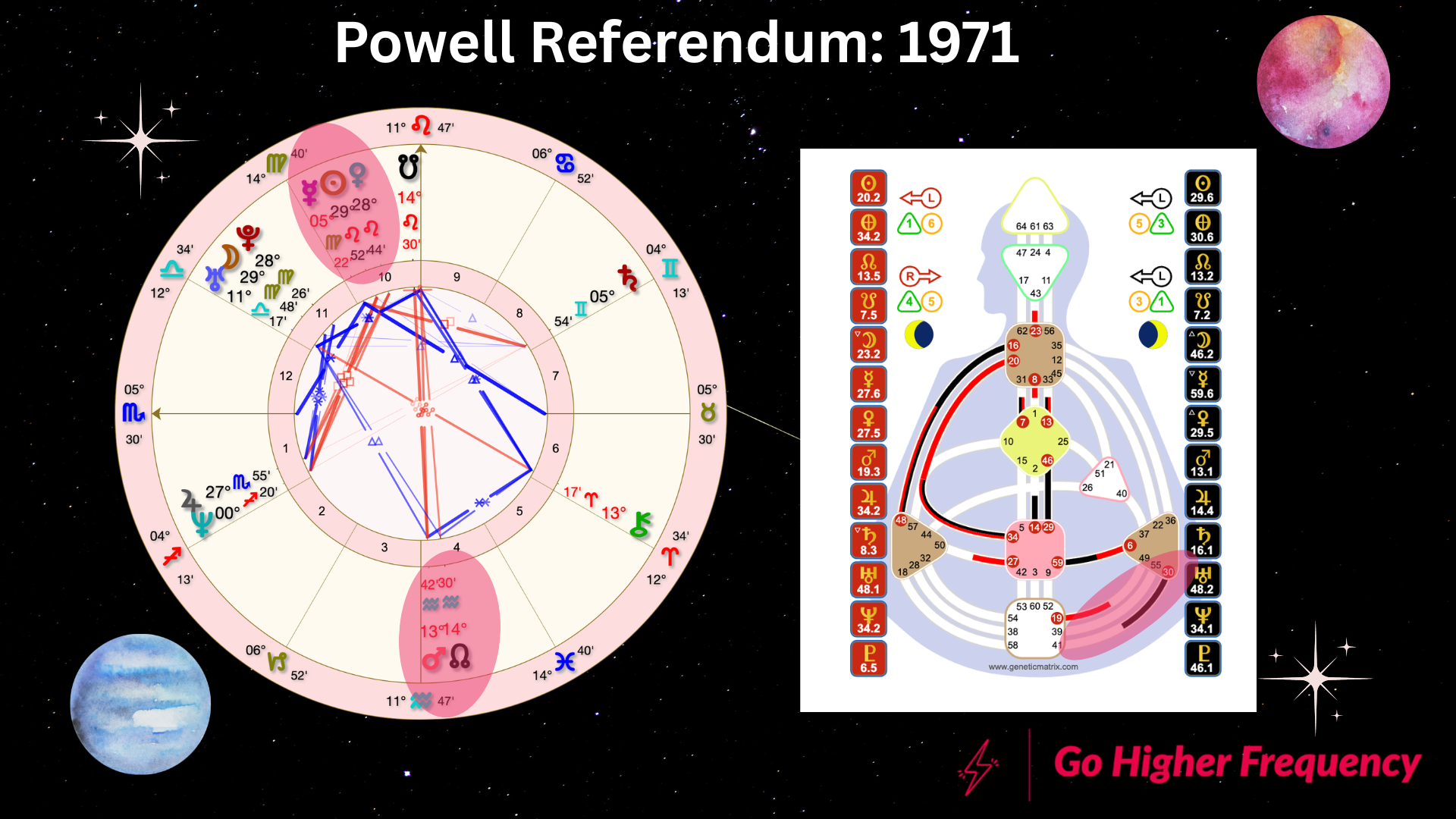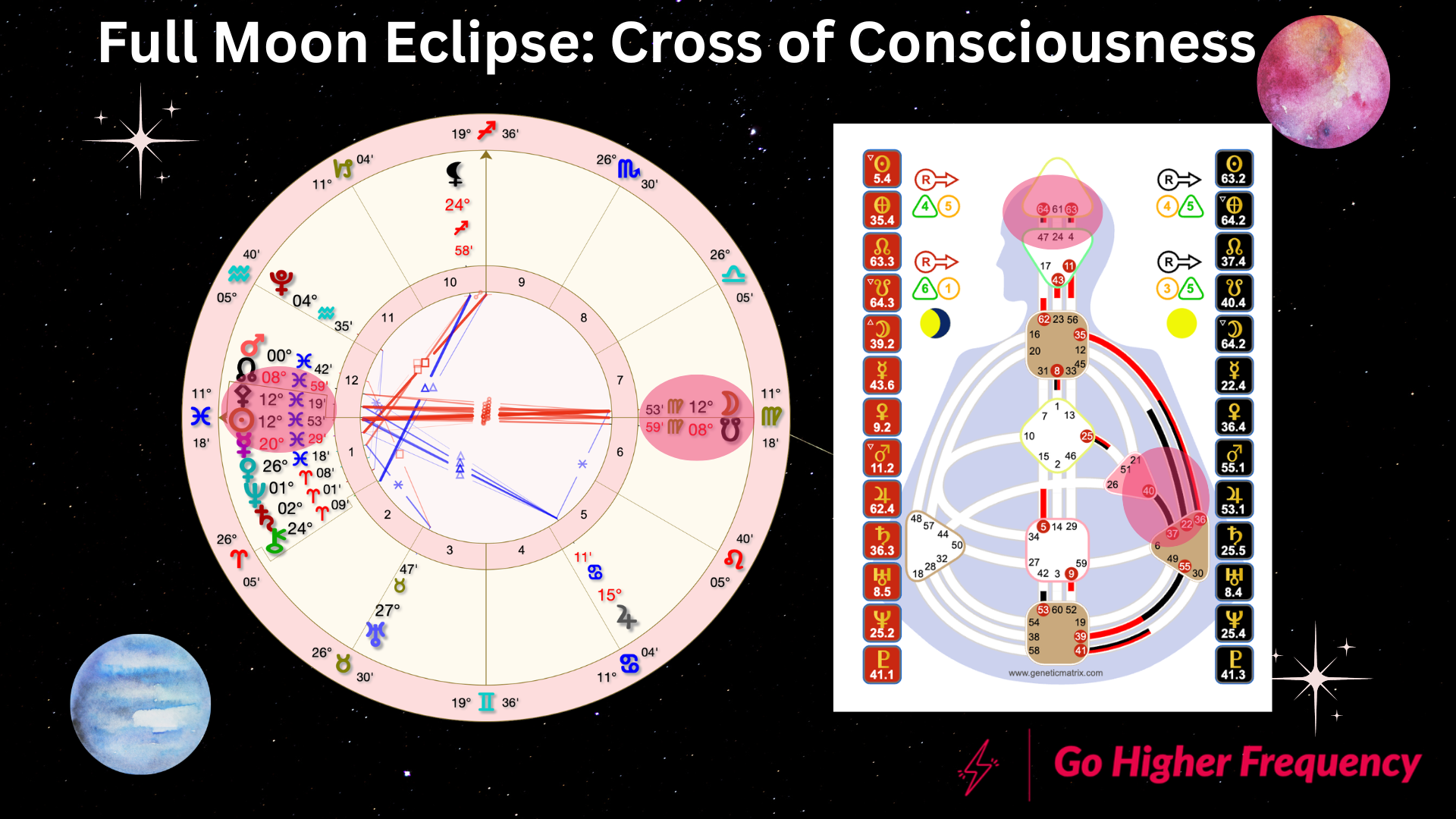 Mercury is retrograde in the Full Moon Eclipse chart. It’s still in the gate of Social Openness (or not) during the Eclipse. But it will move back into gate 63, the gate of Doubt, one of the gates of Consciousness, shortly after this Eclipse. You can learn more about the Mercury retrograde in Pisces here.