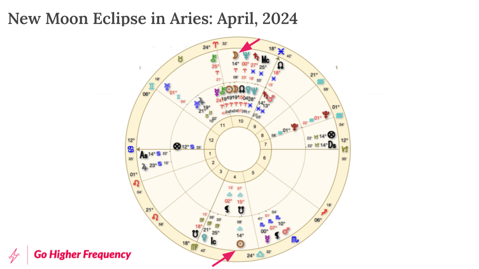 This full moon is related to the April, 2024 New Moon Eclipse in Aries. It is also the first of a series of full moons that are between 12-14 degrees. If you have any planets that are close to these degrees, this full moon is likely to affect you more personally. You may see something you started during the April, 2024 New Moon Eclipse culminating during this Full Moon.