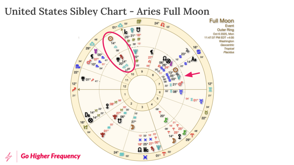 When you look at this full moon around the Sibley chart, we see that the Sun is highlighting the country’s natal Saturn in Libra in the 10th house. With Juno conjunct Saturn and Venus, Saturn’s ruler in Cancer in the 7th, our nation has similar karma around the themes of money, women, family, and relationships.