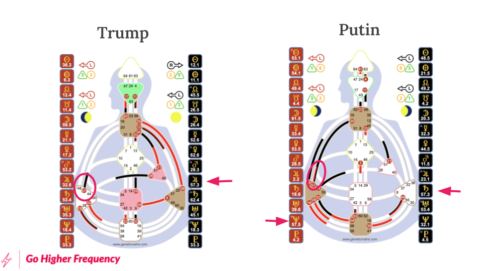 Putin’s Saturn-Neptune conjuncts Trump's natal Jupiter in gate 57. You can see the potential of amplified deception or egoism in this connection. And Uranus is currently in gate 20 completing a channel with gate 57. This connection is contributing to a disruption to the current status-quo of their relationship. Right after Uranus moved into Gate 20 in July, Trump met with Putin in Alaska.