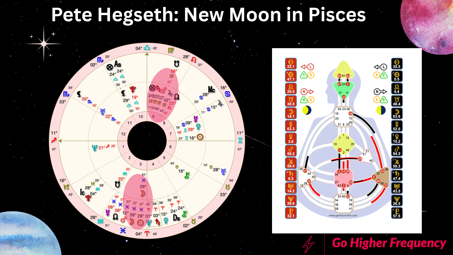 But the intelligence of someone who is right-oriented is highly dependent upon the people they surround themselves with, and right now, Trump has surrounded himself with people who wish to push us into Armageddon. One of those people is Pete Hegseth, whose natal Moon is conjunct this New Moon. Hegseth's natal Moon is just past an opposition with his natal Saturn in Virgo and transiting Mars in Pisces is applying to an opposition of his natal Mars in Virgo.