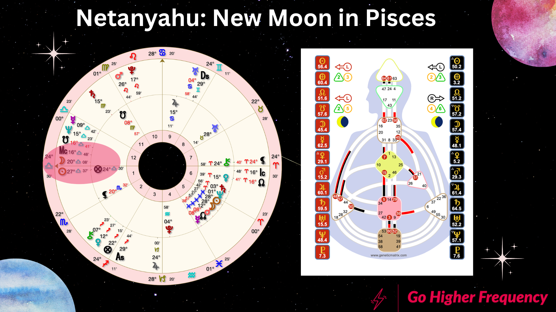 Netanyahu was born in the Dark of the Moon right before a Solar Eclipse in Libra with his Sun at 27° Libra and his Moon at 20° Libra. During his birth, Neptune was conjunct the South Node. It’s no wonder that he has attached himself to a "holy mission" to expand Israel’s footprint, even as others describe him as Godless. Neptune in Libra is more nationalistic than spiritual. He will do whatever it takes to achieve the vision of a “Greater Israel", where he fights to eradicate any existential threat by radical Islamists. How evasive external security becomes for someone with an undefined spleen. One can become trapped in a prison of their own making, constantly looking over their shoulder to ward off threats.