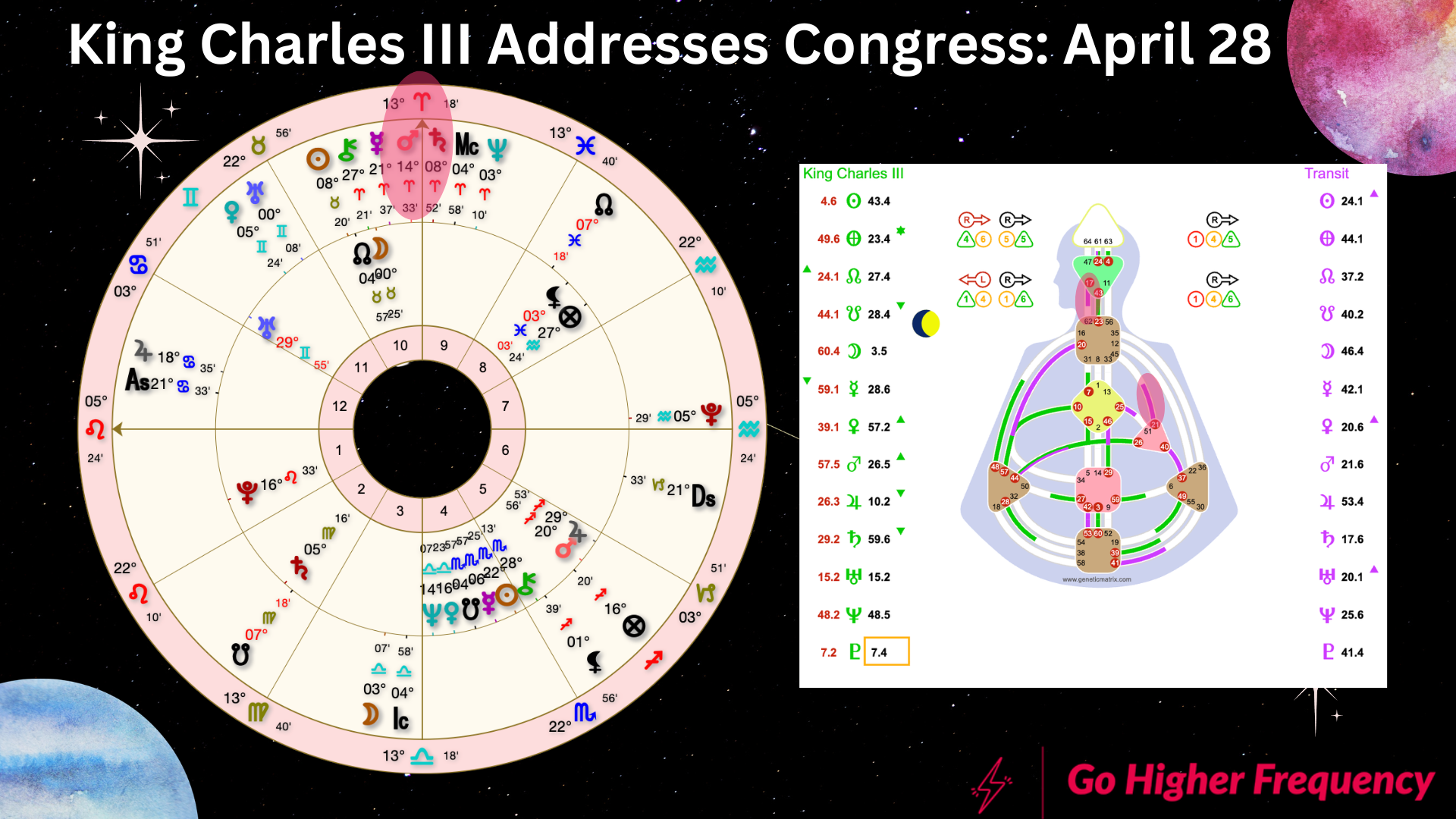 If you remember, it was really hard to keep up with the chaos during this time as Israel ramped up its invasion of Palestine, Trump sent the National Guard into DC, ICE invaded multiple liberal cities, the Justice Department met with Ghislaine Maxwell, and Charlie Kirk was assassinated. We are likely to feel the energy ramp up as Uranus transitions to the Gate of Contemplation in the Now, Gate 20, on April the 28th. King Charles is scheduled to address Congress this day while transiting Mars and Saturn will straddle his MC.